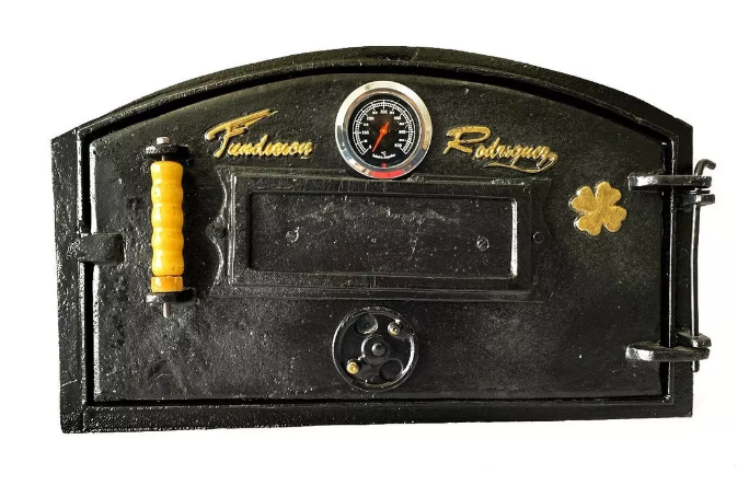 Introducing our premium Cast Aluminum Oven Door, designed without a window for superior heat retention and consistent cooking performance. This oven door is equipped with a built-in thermometer, allowing you to monitor the internal temperature effortlessly. It features a sturdy wooden handle for a comfortable grip and an adjustable air intake to control airflow and cooking conditions precisely. Perfect for your clay or brick oven, this door combines durability, functionality, and rustic charm, making it an essential addition to any outdoor cooking setup.