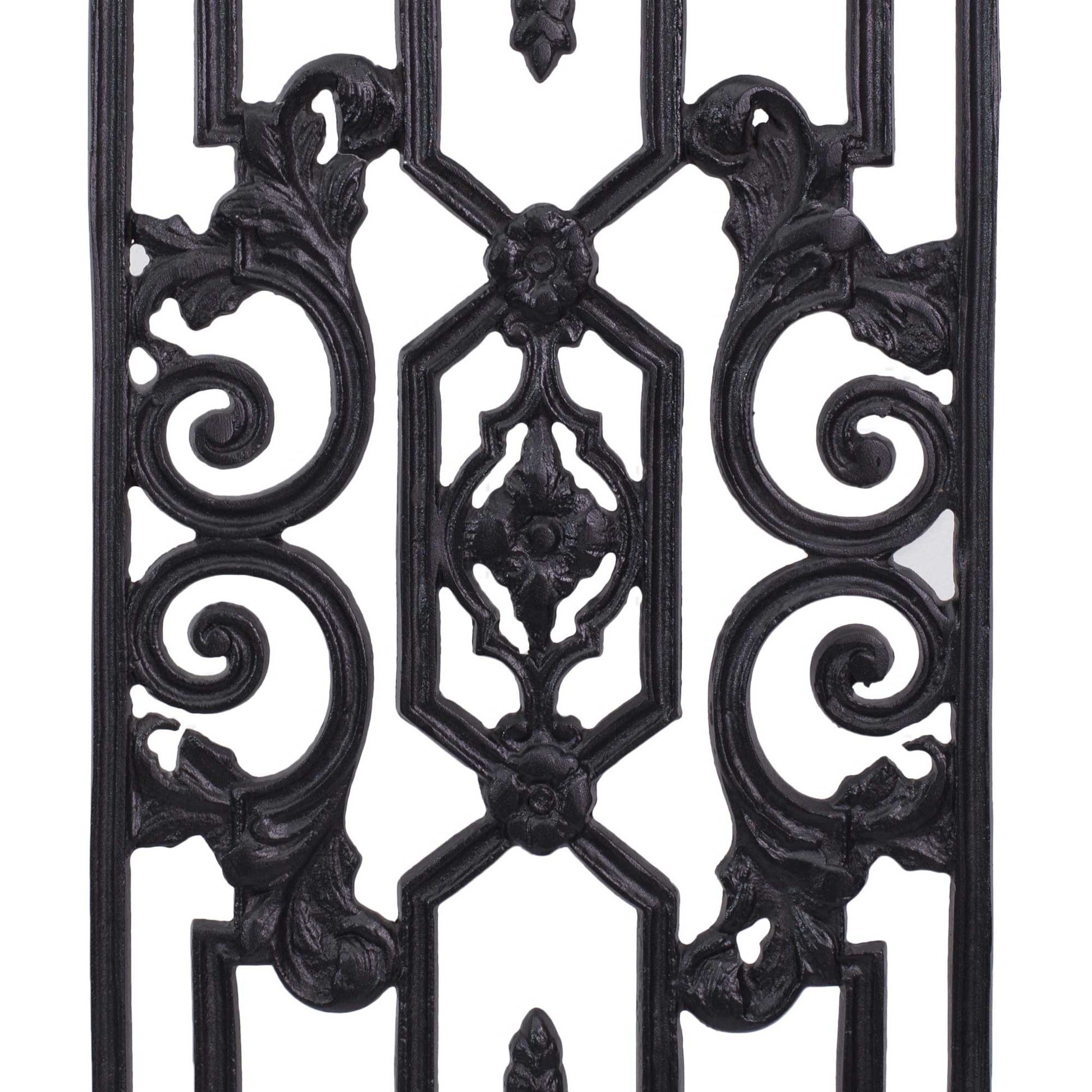 The satin black powder-coated finish, oven-baked for durability, enhances the artistic details while ensuring resistance to corrosion and fading.
